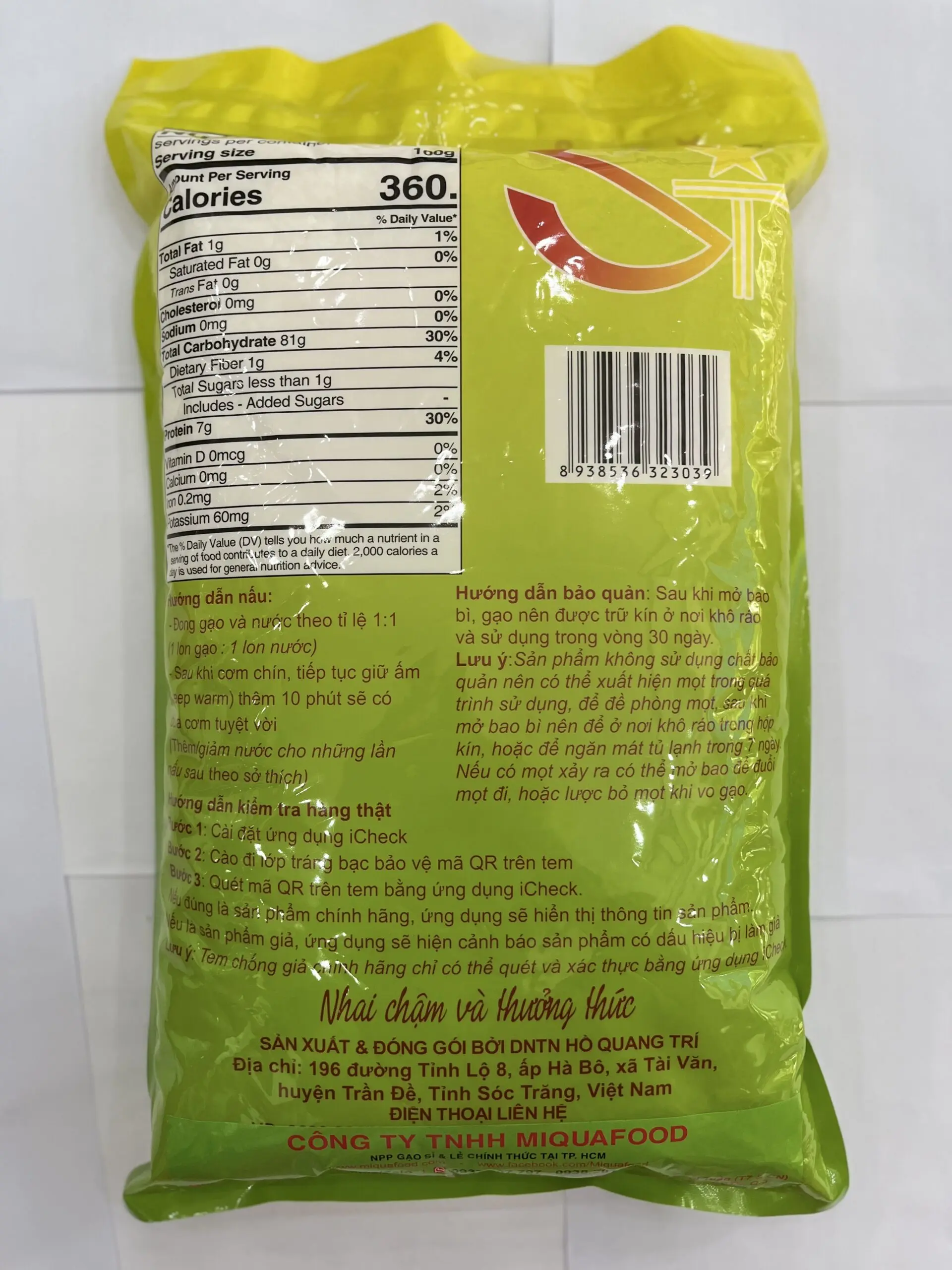 Hướng dẫn bảo quản: Sau khi mở bao bì, gạo cần được trữ kín ở nơi khô ráo và sử dụng trong vòng 30 ngày.